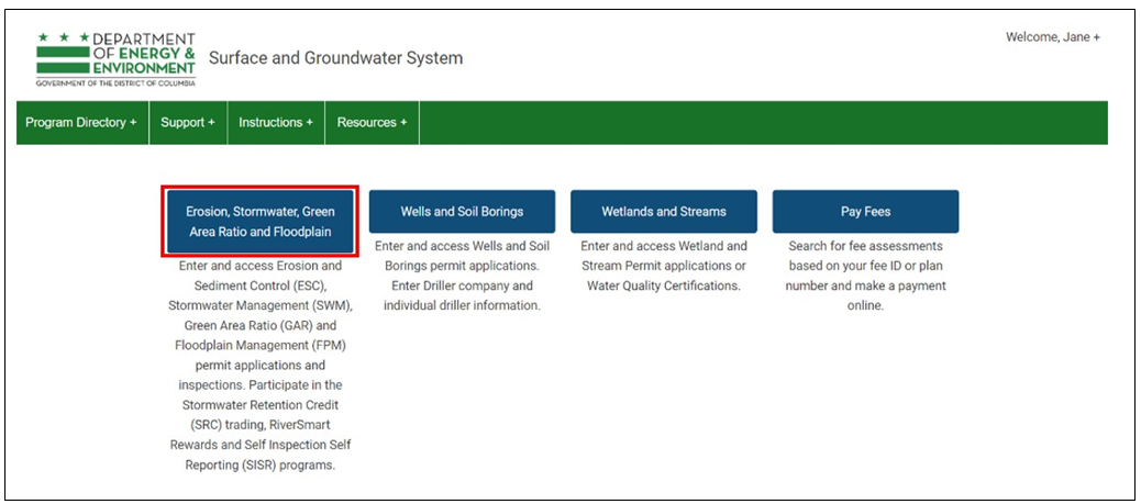 - Log in to the SGS and click the Erosion, Stormwater, Green Area Ratio and Floodplain button.