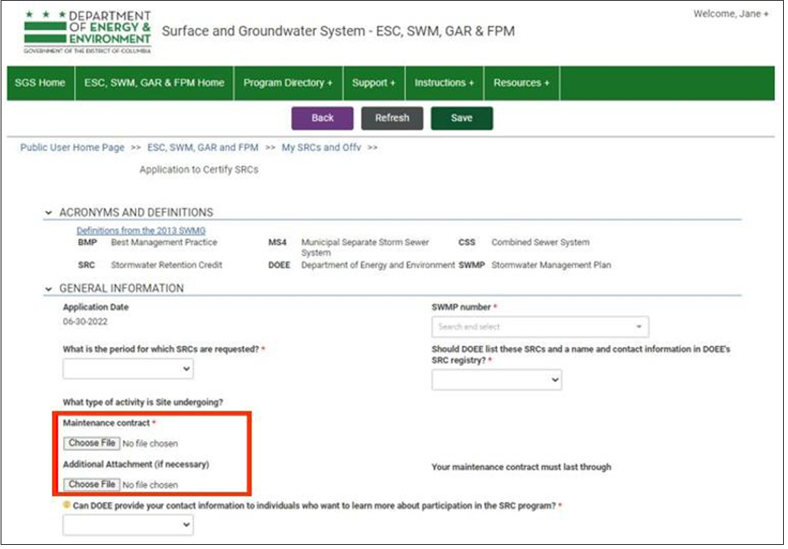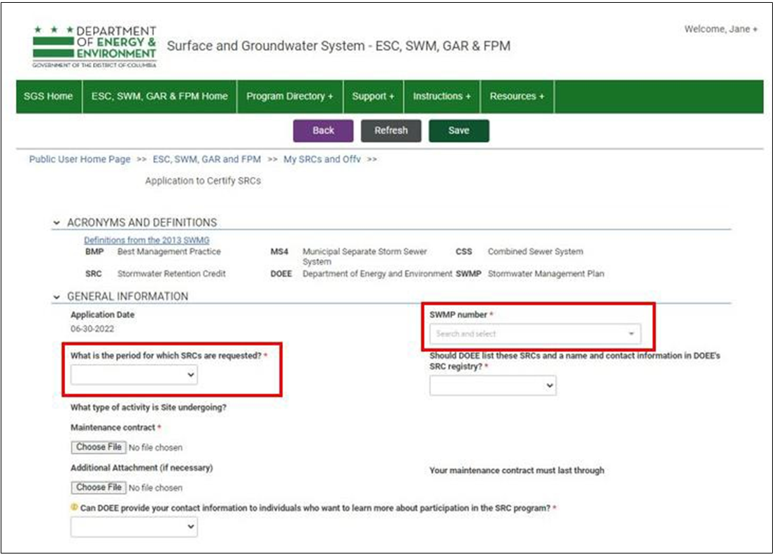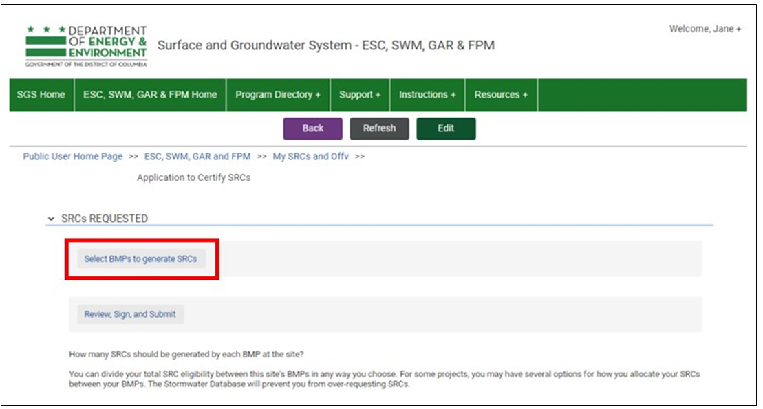 Before you can apply to Certify SRCs, you must already have a DOEE-approved Stormwater Management Plan (SWMP) in the SGS. To complete this application, you also need to know how to open your SWMP and best management practice (BMP) records to view or add information.