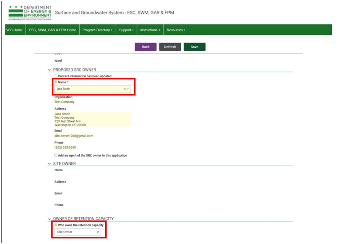 In the Owner of Retention Capacity section, go to the field Who owns the retention capacity and select Site Owner, Proposed SRC Owner, or Other.