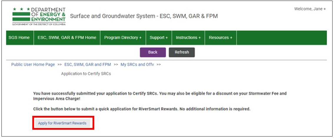 After you submit your Certify SRCs application, a new page will open where you have the option to apply for RiverSmart Rewards to receive a modest discount on your DC Water bill as a benefit for keeping your BMPs in good working order.
