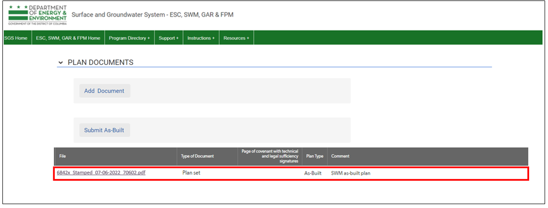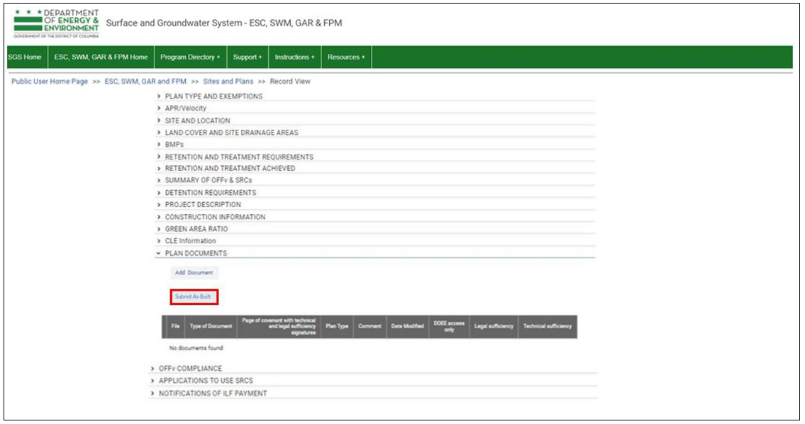 To be able to submit the as-built plan for approval, you must first have an approved SWMP with an approved DOEE final construction inspection in the SGS.