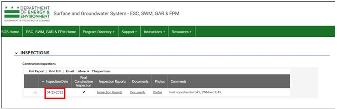 Scroll down to the Inspections section and look for the most recent inspection date. It could be under Construction Inspections or Maintenance Inspections.